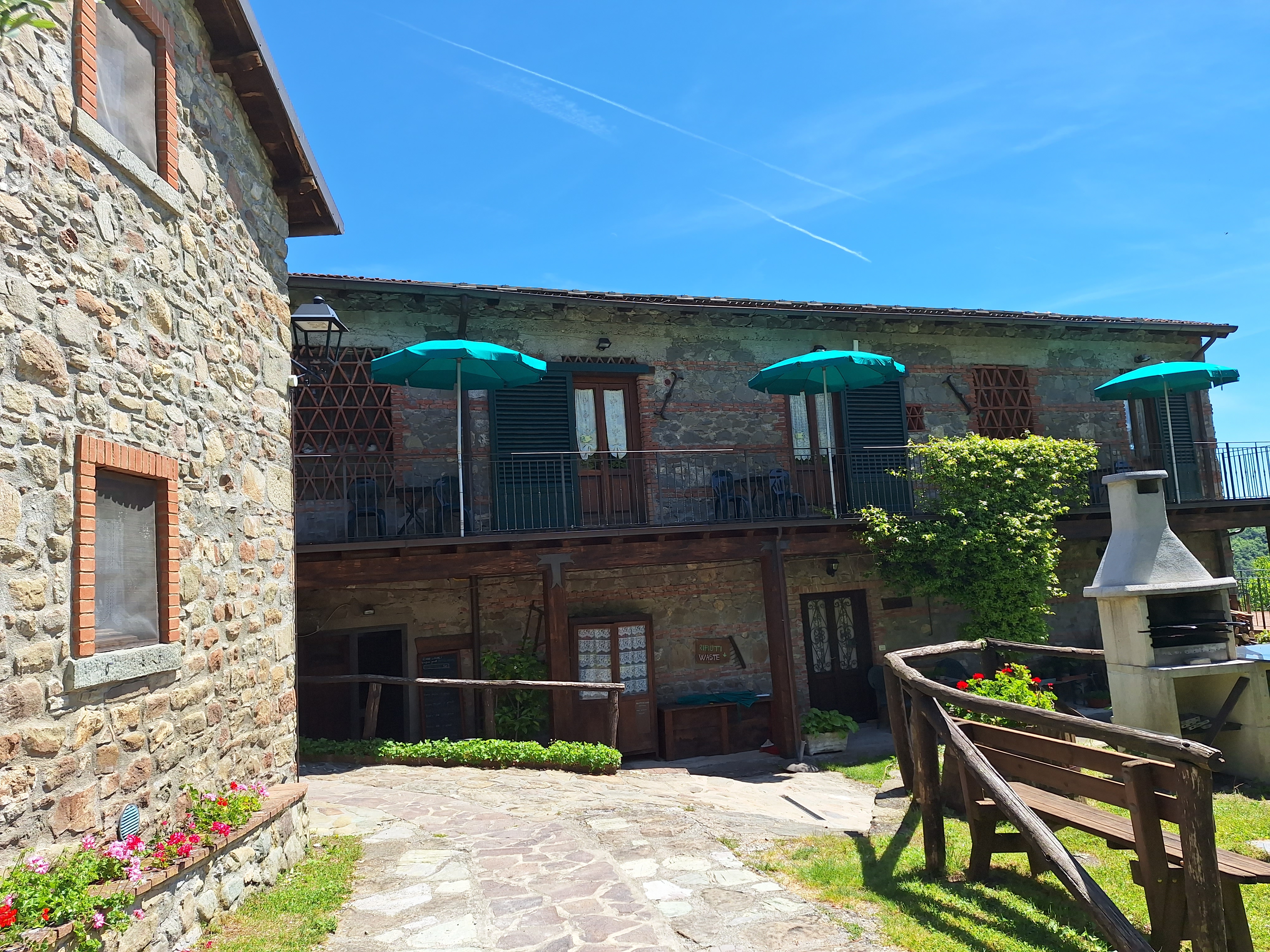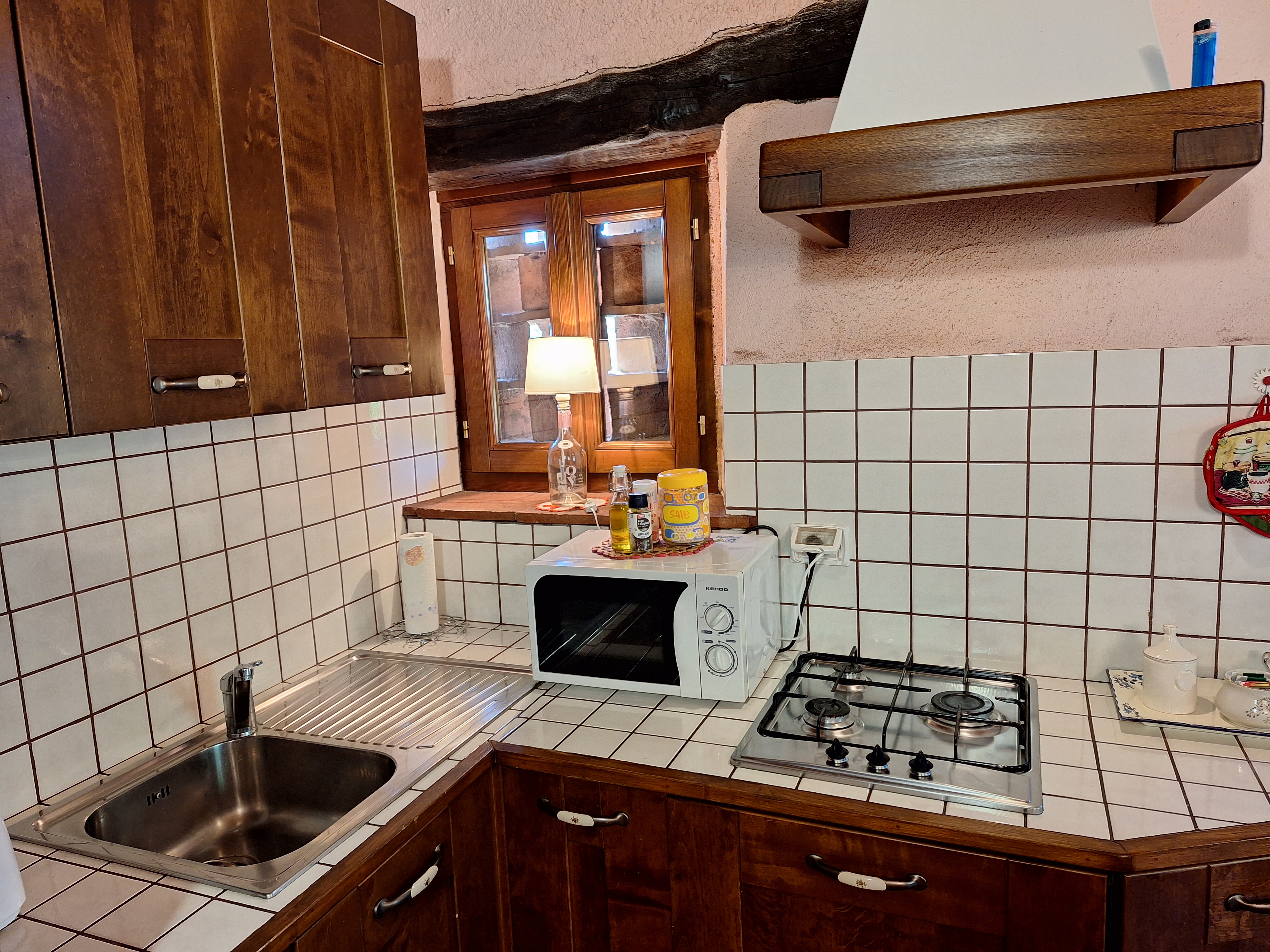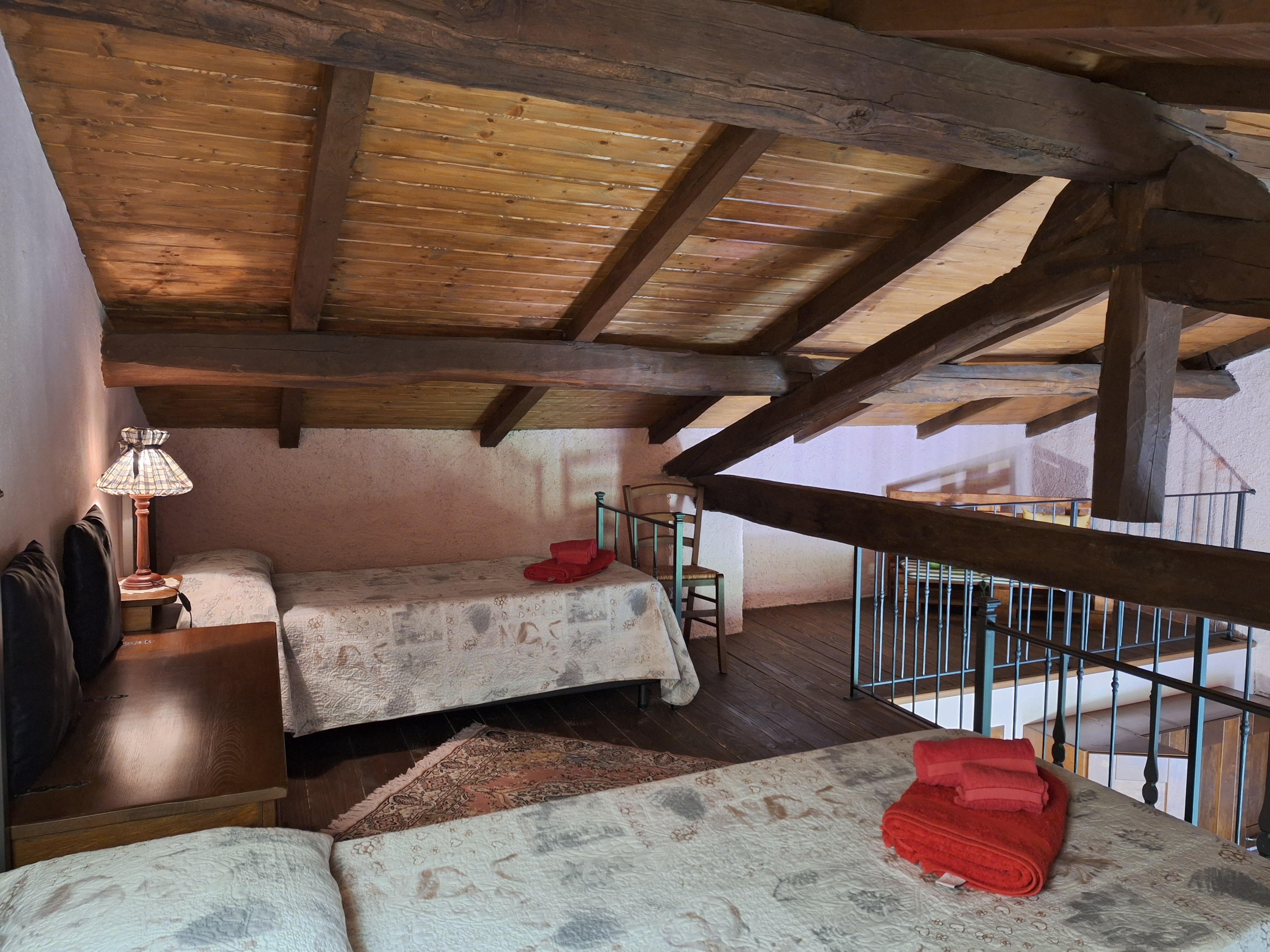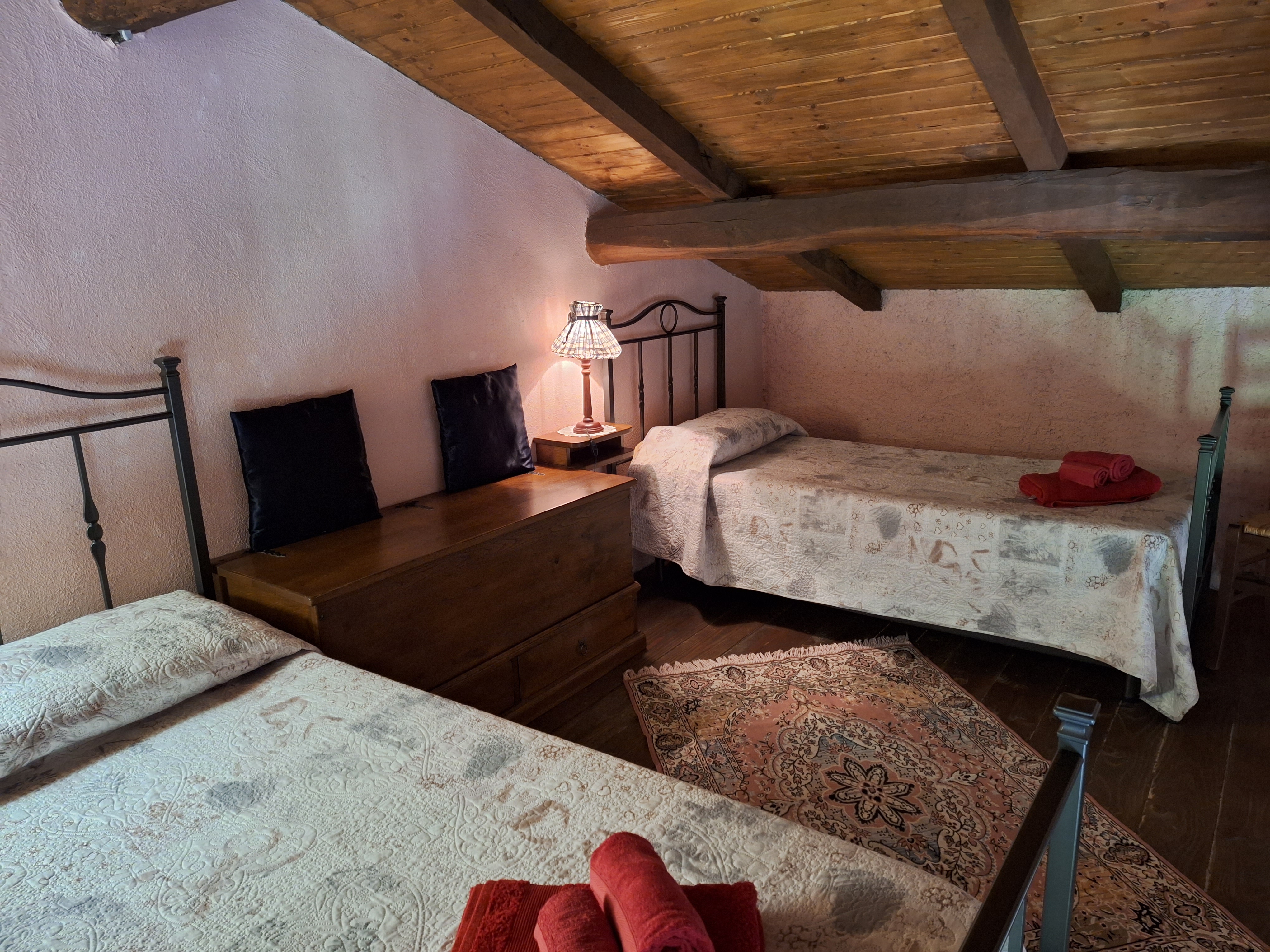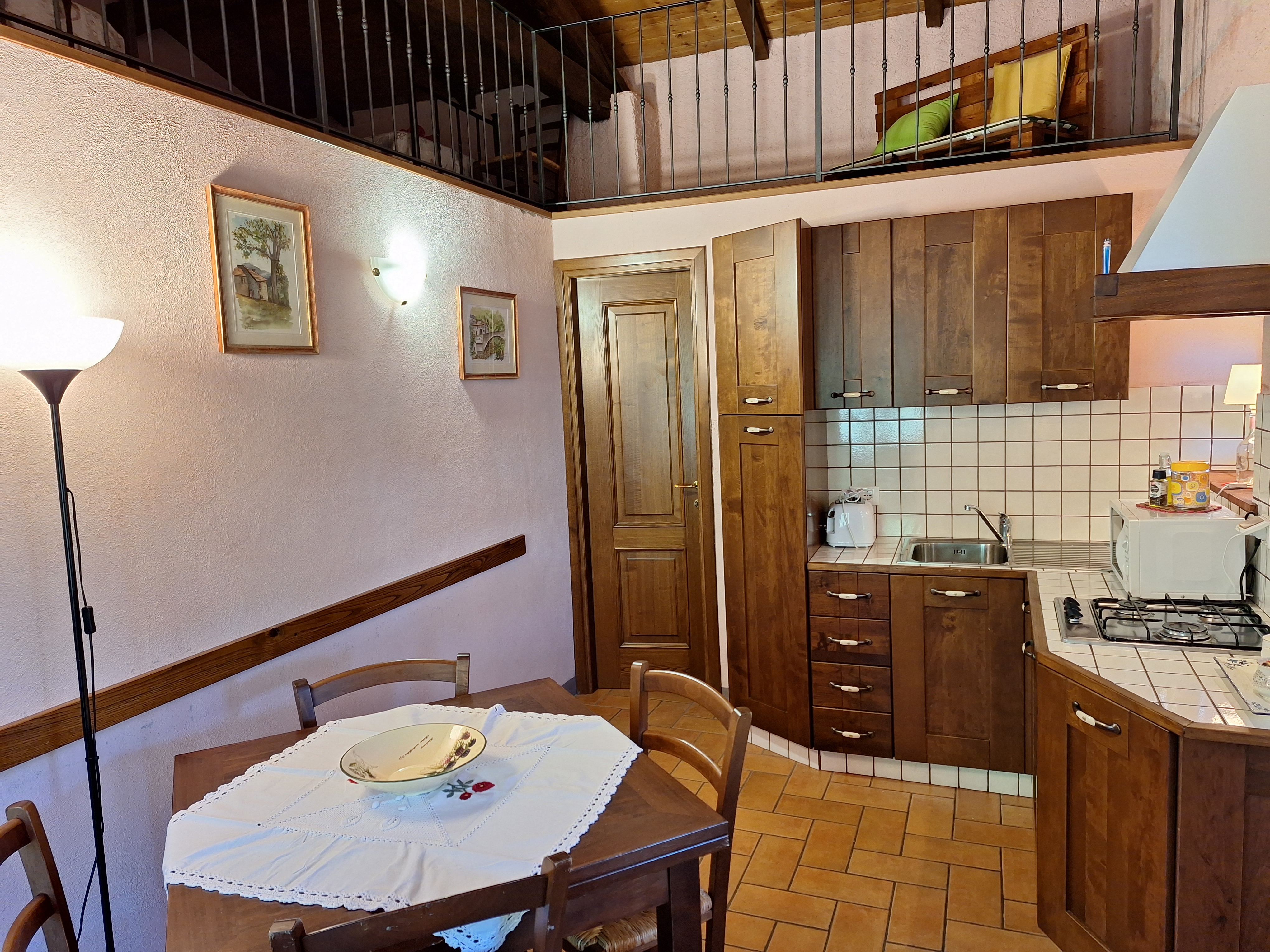 Collocato al primo piano, in ciò che un tempo era un fienile e che oggi ospita tre appartamenti. Si compone di un soggiorno con cucina attrezzata (frigo / freezer, forno a microonde, 4 fuochi, bollitore, stoviglie, tavolo da pranzo e sedie), di un soppalco con due letti singoli, di una camera da letto matrimoniale e di un bagno con doccia e servizi igienici. Per accedere al soppalco bisogna salire da una piccola scala a chiocciola. L'appartamento si trova sotto i tetti, ma il soffitto è abbastanza alto. Un tavolo e delle sedie sono disponibili nel balconcino comune di fronte alla porta d'ingresso.